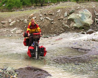 unsere Räder durch knöcheltiefen Schlamm. Um uns herum ragen die Gipfel der schneebedeckten Eisriesen in den Himmel,