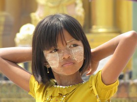 Burmesen auffällt. Die Frauen mit ihren pechschwarzen glänzenden Haaren, sehen in ihren traditionellen