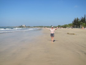 Unser Hill Garden Resort liegt ein bisschen abseits des Hauptstrandes und somit sehr ruhig, überhaupt nicht mit dem Garden Hotel in Yangon zu vergleichen. Wir haben einen schönen Bungalow mit einer großen Terrasse und einer tadellos funktionierenden Dusche und Toilette. Von hier aus gelangen wir durch einen kleinen 5 minütigen Fußmarsch zu einem sichelförmigen Hausstrand. Zwischen einigen Felsformationen schwappt uns kristallklares Wasser entgegen, was Elke sofort dazu bewegt, in dieses kalte Nass einzutauchen. Wir können es nicht glauben, wir sind tatsächlich ganz alleine an diesem herrlichen Strand, an dem nur ein Fischerboot liegt.