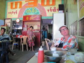 Burmas Küche mit Frankfurter AkzentHallo Ihr lieben Zuhause Gebliebenen … In Bago angekommen werden wir gleich von einem netten Burmesen abgeschleppt. Er verspricht uns das Blaue vom Himmel, gutes Hotel mit Frühstück. Es muss sauber und bezahlbar sein, sage ich zu ihm. Als ich im Zimmer stehe, kann ich es nicht glauben, genauso versifft, wie das Garden Hotel in Yangon. Nur hat das Zimmer einen Gefängnis ähnlichen Charakter und die herausgerissenen Stromleitungen in der Dusche führen bei einer falschen Bewegung garantiert zum sofortigen Tod.