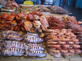 Auf der dem Meer zugewandten Seite befindet sich der riesige Fischmarkt und nebenan der Nachtmarkt,