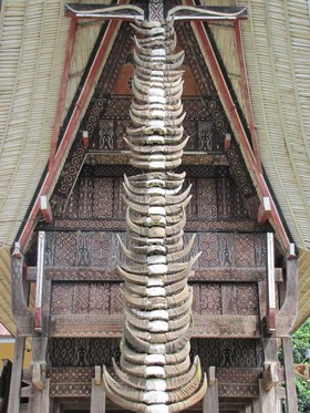 vorderen Stützbalken sehen wir bei einigen Häusern zahlreiche Büffelhörner befestigt, die den