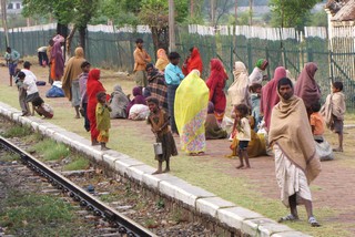 von Menschen springen ständig mit ihrem Hab und Gut kreuz und quer über die Schienen.