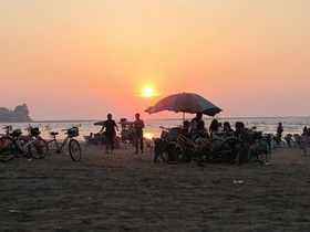 Am nächsten Tag beschließen Elke und ich, uns das Erlebte vom Vortag nicht noch einmal anzutun und so erkunden wir die nördlichen Strände von Chaungtha. Vor uns liegt ein schneeweiser Strand, umsäumt von Palmen, wie auf eine Postkarte gemalt. Am anderen Ende ist auf einem Felsvorsprung eine goldene Pagoda zu erkennen, bei der sich viele burmesische Urlauber herumtummeln. Danach wird es aber auch schon wieder ruhig, ja fast einsam. Elke und ich wandern von einem malerischen Sandstrand zum nächsten, Kilometer weit, bis wir in einem kleinen Dorf umgeben von Palmen frische Kokosnüsse angeboten bekommen. Von diesen Traumständen gibt es auf dieser Erde sicher nicht mehr viele und als wir hören, dass die Chinesen hier riesige Ressorts und Hotels bauen wollen, sind auch hier die Tage gezählt. Elke will unbedingt noch einmal in das Fischerdorf von Chaungtha, was sich am Ende des belebten Standes befindet. Diese Siedlung wurde vor etwa 100 Jahren gegründet und bekam den Namen (thayar) (chaung) woraus Chaungtha wurde und so viel heißt wie Schöner Strom. Das Fischerdorf selbst besteht aus auf Bambuspfeilern gebauten Hütten und sieht im ersten Moment in den grünen Mangroven sehr hübsch aus. Wären da nicht die meterhohen Plastikabfälle. Die Frauen, Kinder, Hunde und Schweine leben mitten in diesen übelriechenden Abfällen. Uns wird es regelrecht schlecht, wenn wir sehen, in welch abartigem Zustand diese Menschen im sogenannten Paradies leben müssen. Morgen fahren wir wieder zurück nach Yangon, sagt Elke. Ja, sage ich, toll, wenn da bloß diese abenteuerliche Busfahrt nicht wäre … Die Rückfahrt gestaltet sich gar nicht mal so schlecht, vielleicht auch weil der Busfahrer fast langweilig fährt. Auf jeden Fall bekommen wir dieses Mal viel von den Flussarmen, den Mangroven und den Menschen, die auf dem Land leben, mit. Elke hat die glorreiche Idee, von Yangon aus direkt weiter mit dem Zug nach Bago zu fahren. Am Fahrkartenschalter bezahlen alle Einheimischen ihr Ticket mit Kyat, nur die Touristen müssen mit Dollars bezahlen. Da wir keine haben, müssen wir die vier Dollar zum schlechten Kurs umtauschen. Wer glaubt, eine Zugfahrt, die ist lustig und angenehm, der war noch nie in Myanmar. Auch hier hatte zunächst -unverständlicher Weise - fast jeder eine Plastiktüte in der Hand. In einem vorderen Abteil ist der Schlafwagon untergebracht, hier lernen wir die zwei netten Herren Bruno und Hans-Peter aus der Schweiz kennen. Sie haben sich eine 2-er Kabine geleistet, schließlich wollen sie bis nach Mandalay und das sind immerhin so um die 15-17 Stunden Zugfahrt. Hans-Peter sagt, diesen Luxus haben wir uns einmal gegönnt, damit wir heute Nacht gut schlafen können.