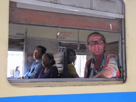 Als ich wieder auf meinem Sitz sitze und mich freudenstrahlend umschaue, erkenne ich die vielen schwarzen vollgeko… Tüten. Schlagartig wird auch mir schlecht und ich bin froh, dass wir Bago nach zwei Stunden abenteuerlicher Zugfahrt erreichen. Wir verabschieden uns von Bruno und Hans-Peter. Lachend sagt Bruno, wir haben ja nur noch 13-15 Stunden Zugfahrt vor uns. Mit den liebsten Grüßen