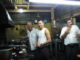 Die Chefin hat meine Beobachtungen bemerkt und fängt an zu grinsen und es dauert auch noch eine Weile, bis sie mit der Sache herausrückt. Naja, sagt sie, wo sollen sie denn auch hin, zu mir kommen Junge wie Alte, die Zuhause keine freie Minute haben. Auch ich musste jetzt grinsen und sage, dass ist nicht nur in Myanmar so, das ist doch überall auf der Welt das Gleiche, worauf wir beide lauthals lachen müssen. Als uns Myo sieht, hält er schon ein Bier in der Hand, er freut sich, dass wir ihn wieder beehren. Elke und ich haben Hunger, wir sind gespannt, was uns der Küchenchef heute Abend serviert. Freudestrahlend kommt er persönlich aus der Küche und serviert uns einen interessanten und lecker schmeckenden Tea-Leafsalat, dessen Zubereitung er uns erklärt. Zuerst werden Teeblätter in Wasser und Essig eingelegt, dazu kommen Streifen von Karotten und Weißkraut, Knoblauch und Zwiebeln, im Mörser zerkleinerte getrocknete Shrimps, Tomatenstückchen und eine kleine Chilischote, je nach Schärfe, dazu. Das Ganze mit Pfeffer, Salz und Zitronensaft abmischen, auf dem Teller servieren und als Top, eine Röstmischung bestehend aus verschiedenen Nüssen, Knoblauch, gelben Linsen und Bohnen drüber streuen. Dazu fehlt nur noch ein Auxerrois von Priska und Robert Schneider vom Weingut Rössler-Schneider in St Martin, dann wäre das Essen perfekt. Der zweite Gang kommt mir sehr gelegen, gekochtes Ziegenfleisch in einer kräftigen Zwiebel-Knoblauchsoße und dazu herrlichen Duftreis. Da fehlt eigentlich nur der kräftige St. Laurent von Hartmut Bender, Weingut Kronenberg aus Kallstadt, darf man träumen. Wir verabschieden uns von Myo, seiner Familie und seiner Küchenmannschaft, bedanken uns für die hervorragende Bewirtung und wünschen ihm, dass er alles erreicht, was er sich vorgenommen hat. Mit den liebsten Grüßen